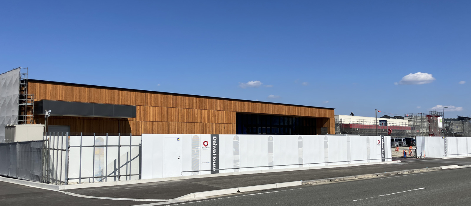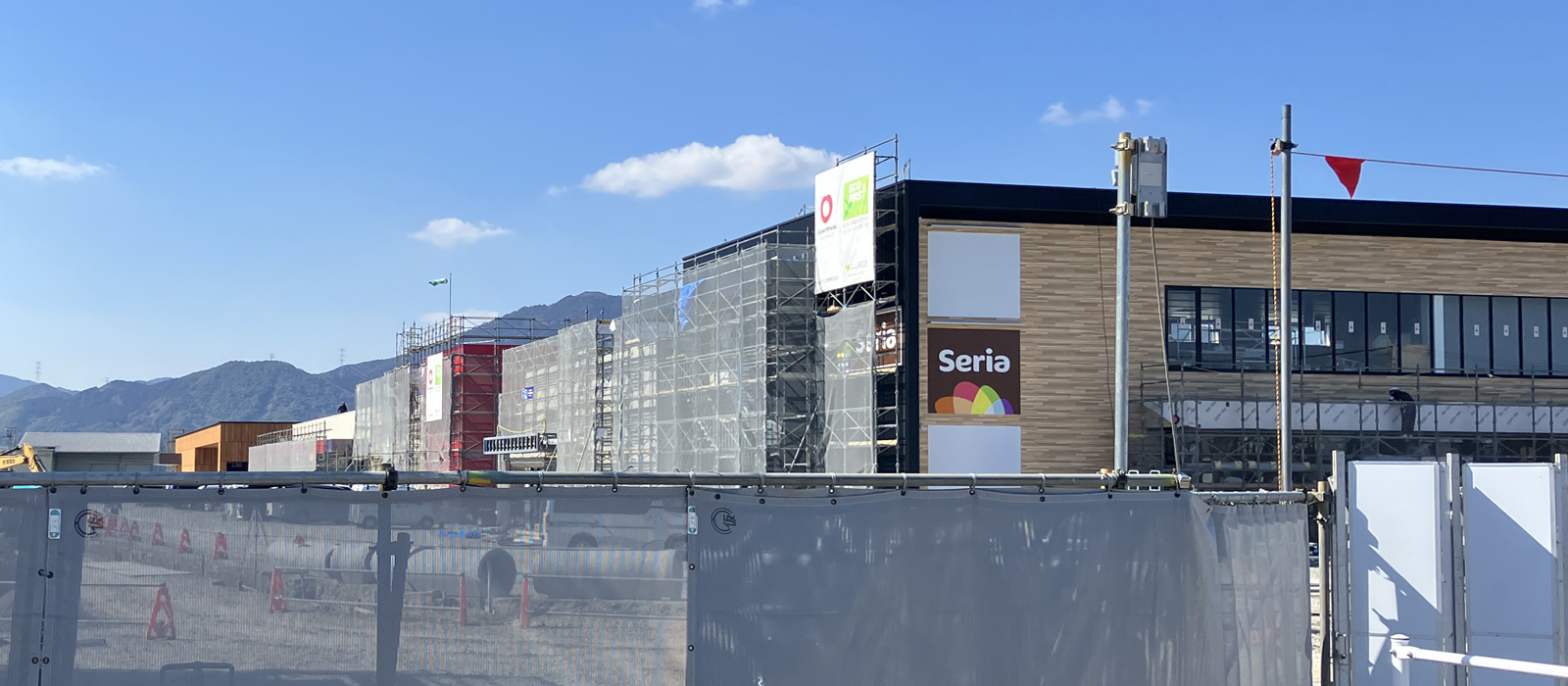 広い敷地内には、食品スーパーのロピア、無印良品、西松屋、セリア、メガネのJINSなどの店舗がオープン予定とのこと。