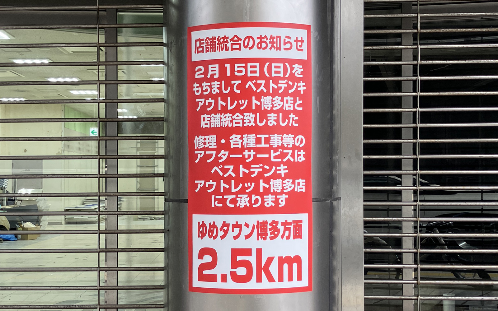 2026年2月15日(日) 、福岡市中央区・天神1丁目の家電量販店「ベスト電器 福岡本店」が閉店するそうです。