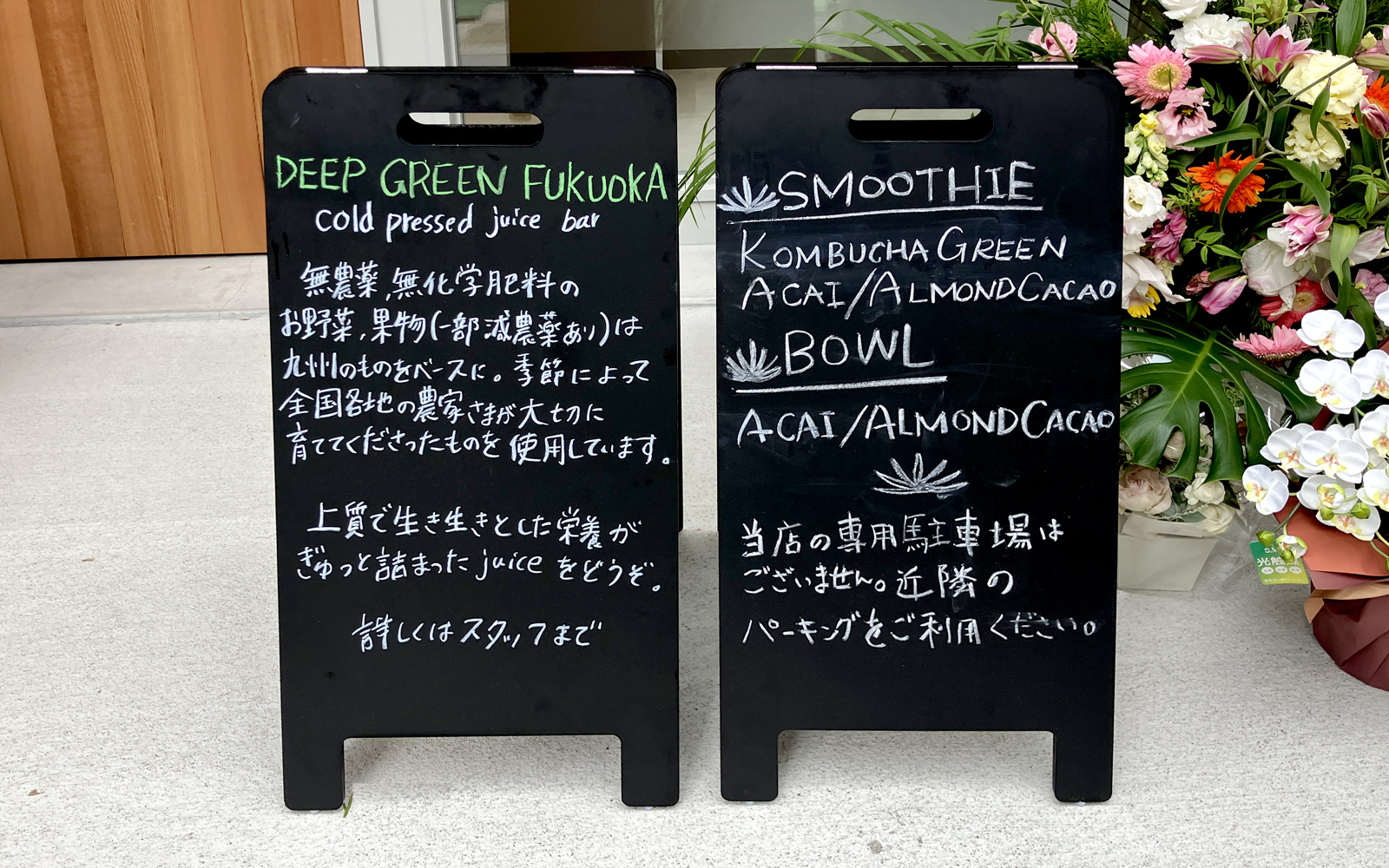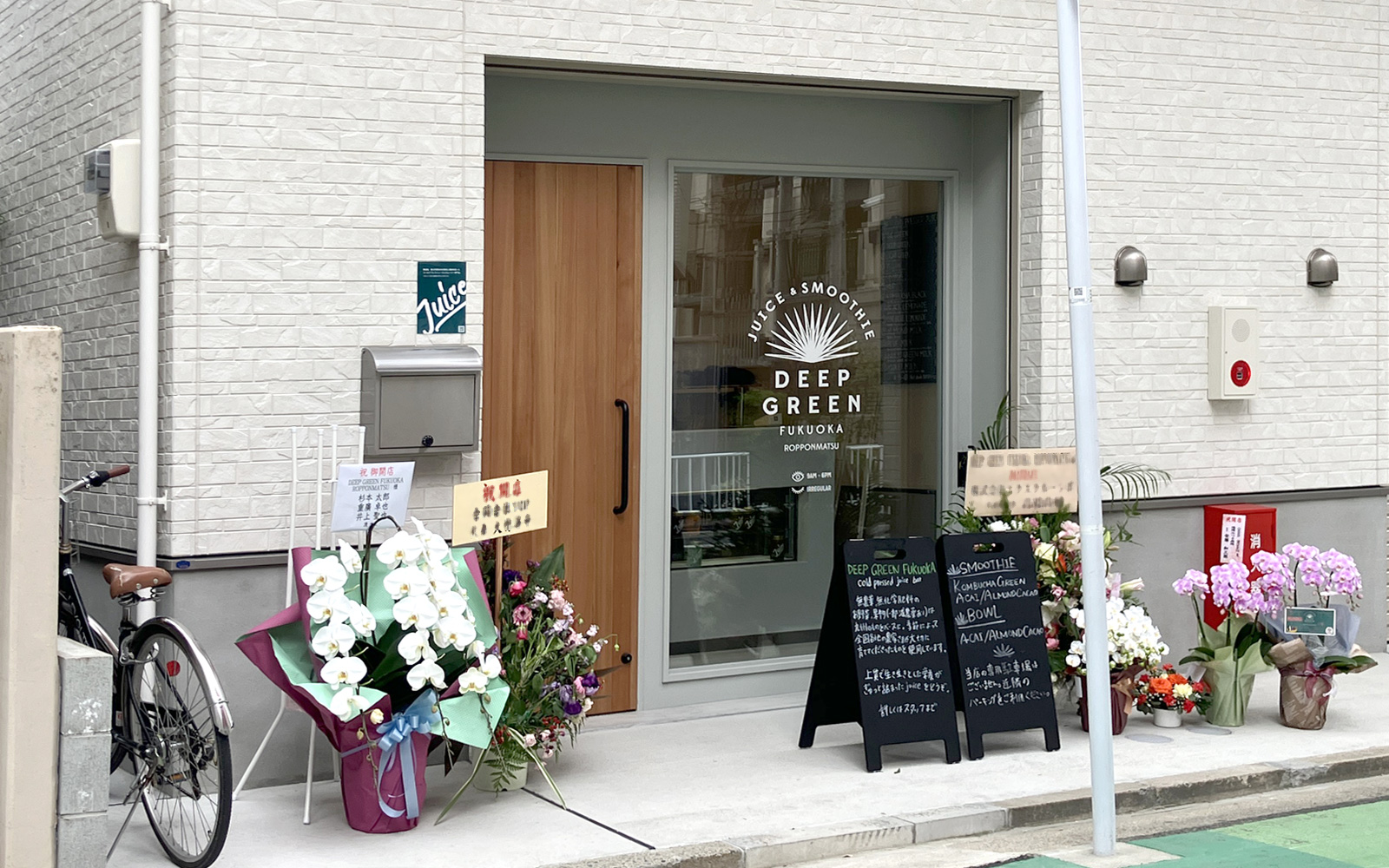 DEEP GREEN FUKUOKAは、無農薬、無化学肥料の野菜と果物を使ったコールドプレスジュースとスムージーの専門店です。