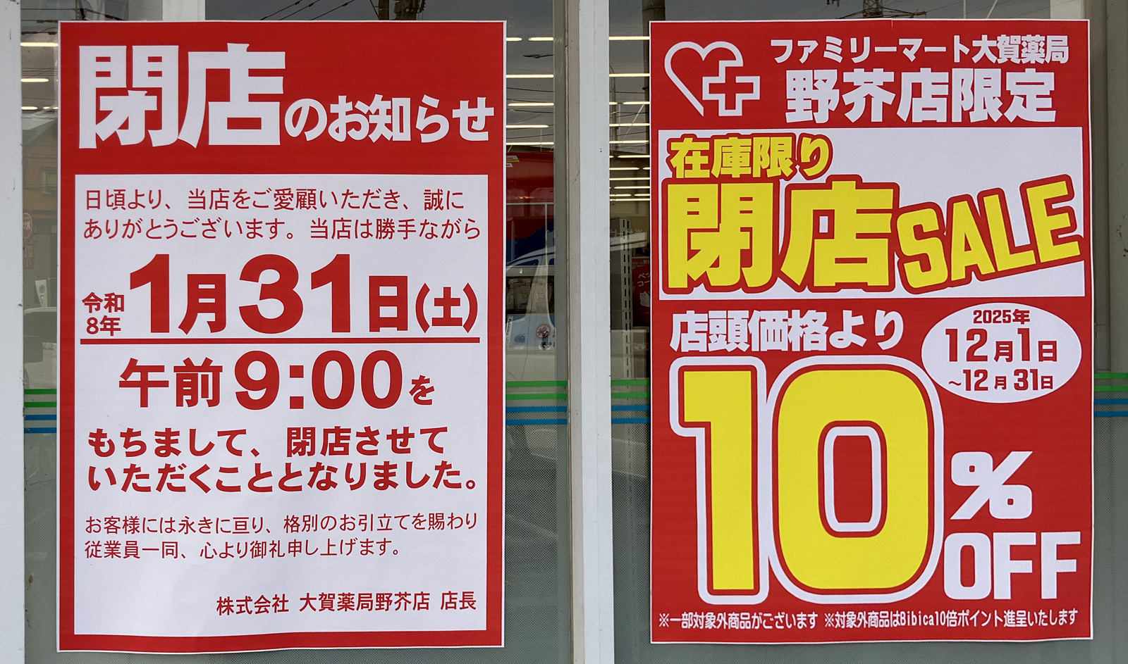 野芥店では、2025年12月1日~12月31日まで「閉店セール」が行われるようです。