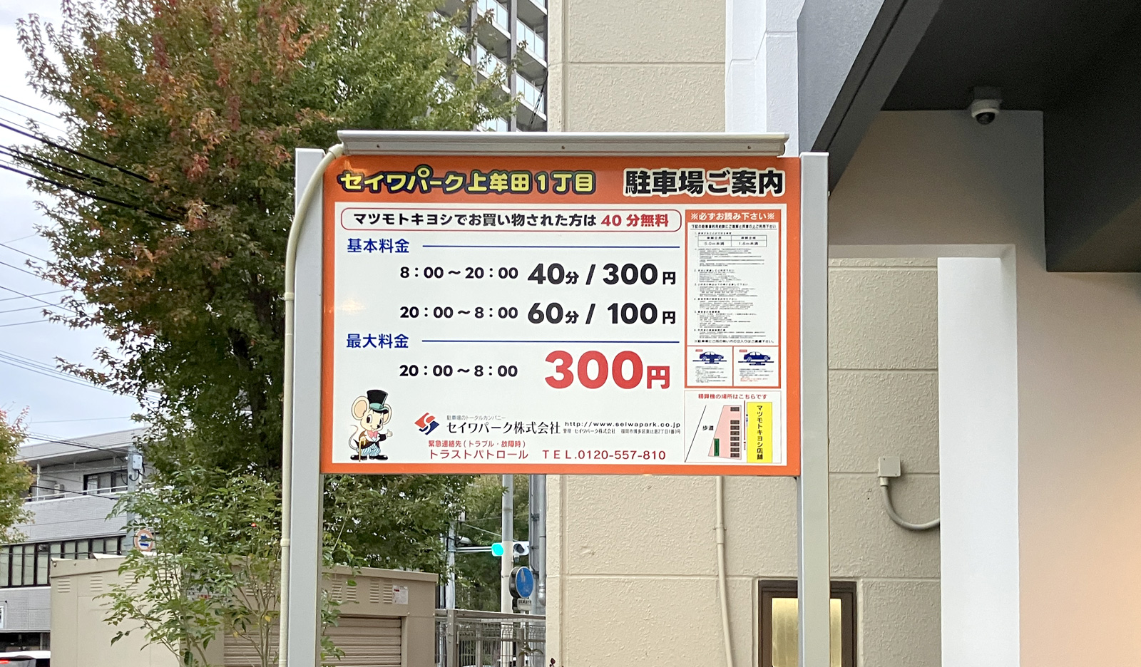 店舗前には、8台分の駐車場あり、マツモトキヨシでお買い物をした場合は「40分無料」の駐車券が発行されていました。