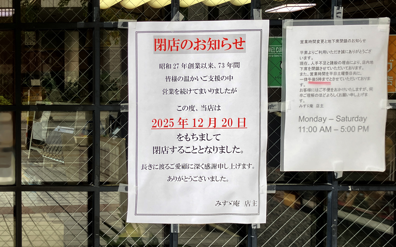 「そば処 みすゞ庵(みすずあん)」が、ビルの解体に伴い閉店となるそうです。