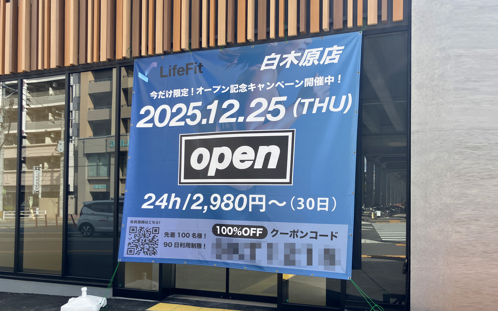 白木駅の北側には、24時間気軽に楽しめるフィットネスジム「LifeFit」が12月25日 (木) にオープン予定。現地では100%オフのクーポンも掲示されていました。
