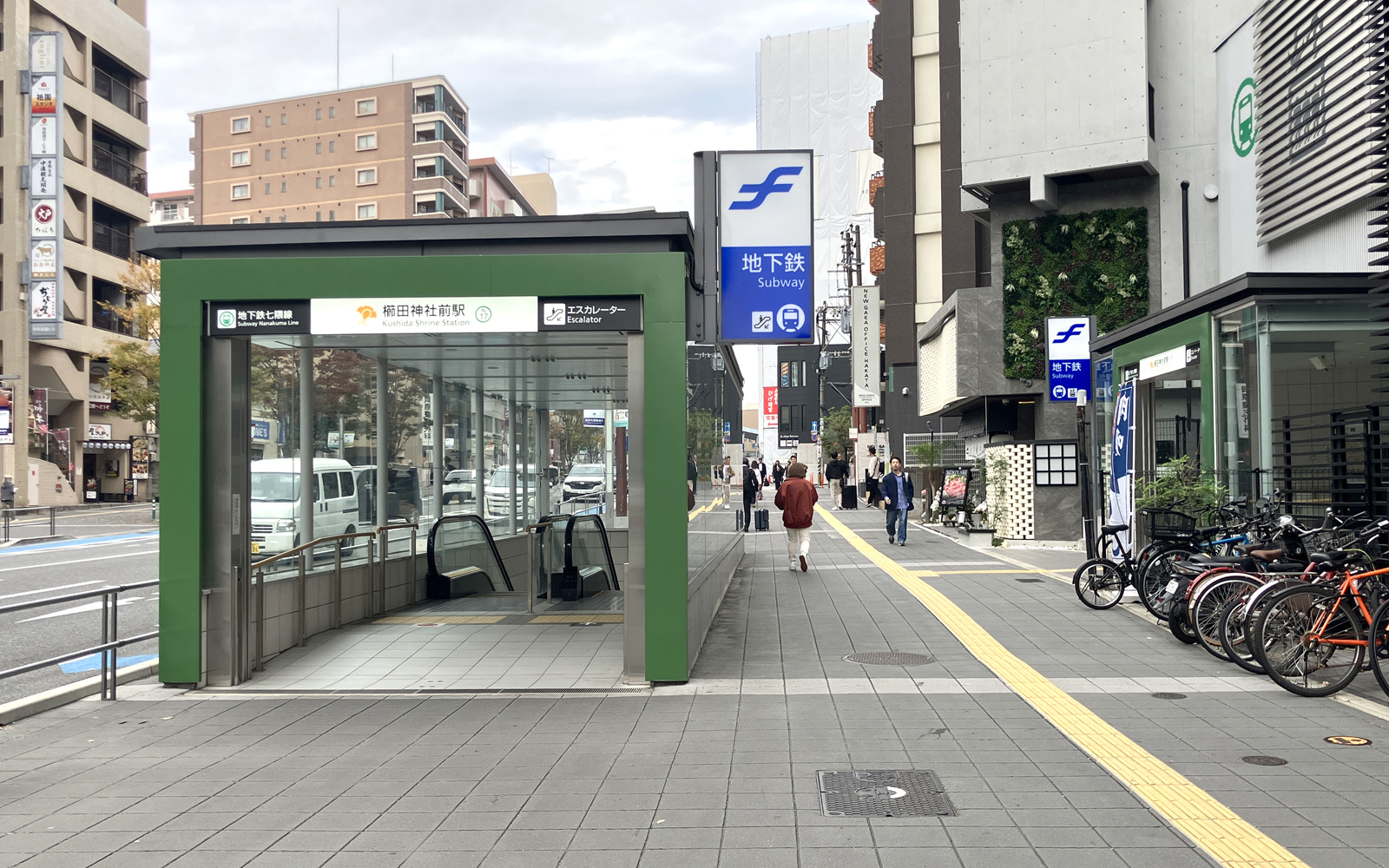 場所は、地下鉄七隈線「櫛田神社前」5番出口を出て30秒のところです。