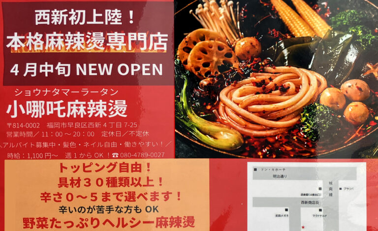 2026年4月中旬、福岡市早良区・西新に「小哪吒麻辣燙(ショウナタ マーラータン)」がオープンするそうです。